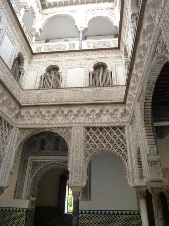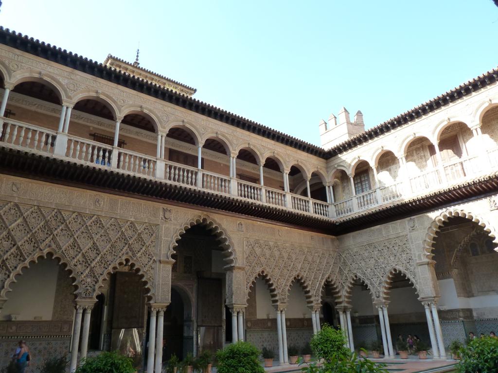 Gần như đối diện nhà thờ là Alcázar, pháo đài Arab của Sevilla. Mình chưa đến một nước Hồi giáo nào bao giờ, nên cũng không biết rõ về phong cách Hồi giáo lắm, chỉ biết là cái này đẹp, rất đẹp, nhìn thấy mê. Các bạn Sevilla làm ăn rất tốt, chìa thẻ sinh viên là vào cửa miễn phí, mặc dù vé bình thường là 10e, chứ không như nhiều bạn chỉ giảm cho 1-2e (a.k.a Phần Lan). Vào đây đúng là như lạc vào thế giới khác, có cảm giác không phải ở châu Âu nữa mà là đang ở một nước Bắc Phi nào đấy. Ở giữa pháo đài là một vườn cam xanh ngắt, được tô điểm bằng những quả cam mọng nước, sai trĩu cành, bên cạnh những nhành hoa e ấp, hé nở chào đón ánh nắng ban mai rực rỡ. Nhắm mắt im nghe tiếng chim hót, tiếng lá kêu xào xạc trong gió, quyện cùng mùi hương thoang thoảng của cỏ cây, hoa lá.