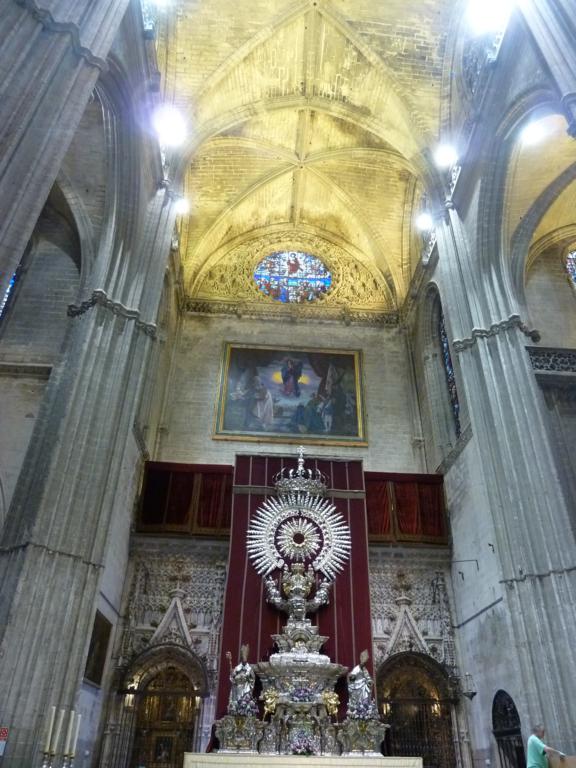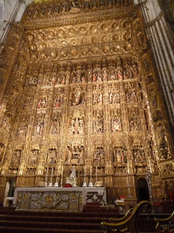 Đi loăng quăng khu trung tâm sẽ không thể không bị đập vào mắt một khối kiến trúc Gothic to lù lù, đó chính là nhà thờ Sevilla. Về mặt diện tích thì đây là nhà thờ lớn thứ 3 thế giới, sau Vatican và Westminter, nhưng các bạn Sevilla không cam chịu, nên vẫn kêu là nhà thớ lớn nhất thế giới, tính theo thể tích. Quả thật là mình chưa thấy công trình kiến trúc nào dùng đơn vị thể tích cả, trừ mấy cái bể nước, càng chưa thấy đề cập đến thể tích nhà thờ bao giờ. Nhưng thôi cứ cho các bạn ý tự sướng, vì đúng là cái nhà thờ này to thật, mà lại kiểu Gothic, đúng phong cách nhà thờ mình thích. Mình được cái không khoái mấy nhà thờ kiểu Baroque hay mấy kiểu mới mới xanh xanh đỏ đỏ tý nào, cứ phải tháp cao chót, màu xám xịt, bên trong kính màu nhìn nó mới liêu trai. Trèo lên đỉnh tháp cũng có tí vất vả, nhưng bù lại sẽ nhìn được toàn cảnh thành phố. Đường càng lên càng hẹp, nên gặp mấy bạn to to thì tránh xa tý không lại thành 2 con dê qua cầu.