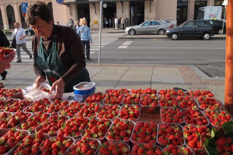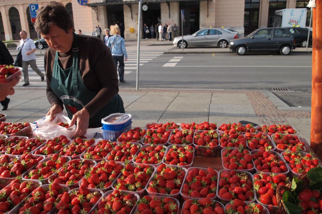 Ở Zagreb lúc mình đi là vào mùa dâu, ở đâu cũng thấy bán dâu, mà giá lại khá là rẻ, 10kuna 1 hộp. Ngay trước gat rung tâm là một dãy quầy bán dâu, phải đến 20 hàng là ít. Còn chạy ra chợ trung tâm thì vô biên. Mà số mình cũng may, chả hiểu sao ở Zagreb có 2 đêm mà đêm nào ra trung tâm cũng có ca nhạc miễn phí. Các bạn ở đây có vẻ thờ ơ, bởi mặc dù sân khấu, âm thanh, ánh sáng cũng tương đối hoành tráng mà người xem không được đông cho lắm. Chả bù với Helsinki, có tí tẹo nhạc nhẽo miến phí nào là người ở đâu kéo đến ùn ùn, trong khi bình thường ra đường thì vắng như chùa bà Đanh.