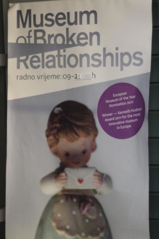 Ở Zagreb cũng có mấy bảo tang cũng vui. Hôm đi bảo tàng dân tộc học, mình vào hỏi mua vé, chìa ra tờ 100 kuna (tầm 13e) để mua vé. Bác bán vé tìm một hồi không có tiền trả lại xua tay ý bảo thôi mày cứ vào đi. À vâng, cháu cảm ơn bác. Vào mới phát hiện ra đang có triển lãm bia ở trong đấy, mỗi khách tham quan được một cốc bia miễn phí. Vừa được vào bảo tang, vừa được uống bia, tất cả lại miễn phí, thật tình mình cũng rất ưng cái bụng. Zagreb còn có bảo tang Broken Relationship, triển lãm những hiện vật của các đôi lứa yêu nhau, chủ yếu là các đôi ở Châu Âu. Bảo tàng này từng được trao giải bảo tàng sang tạo nhất châu Âu năm 2011. Vào xem cũng vui, có đôi hiện vật là cái thuyền, cái hộp, thậm chí có cả đồng 100 sek.