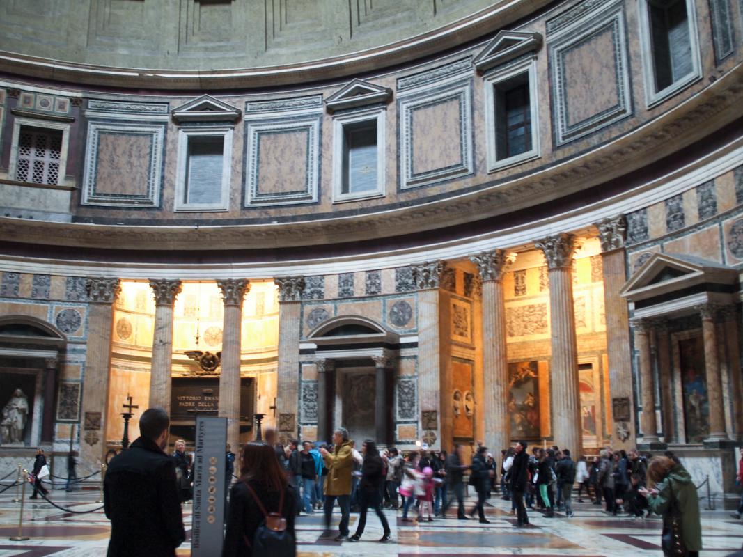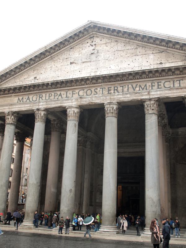 Một di tích nổi tiếng thời cổ đại của Rome là điện Pathenon. Không hiểu cái điện này xây chủ ý thế hay nó bị vỡ kính mà mái vòm của điện hở ra một lỗ khá to. Chắc tại hồi xưa chưa làm được kính, mà lại muốn đón ánh sáng của thần thánh nên phải để hở ra như thế. Hôm đến Pathenon trời mưa như trút nước nên có thể thấy rõ từng hạt mua rơi lộp bộp trong điện, may mà chưa làu bàu chửi xây dựng kiểu gì mà dột nát thế này.