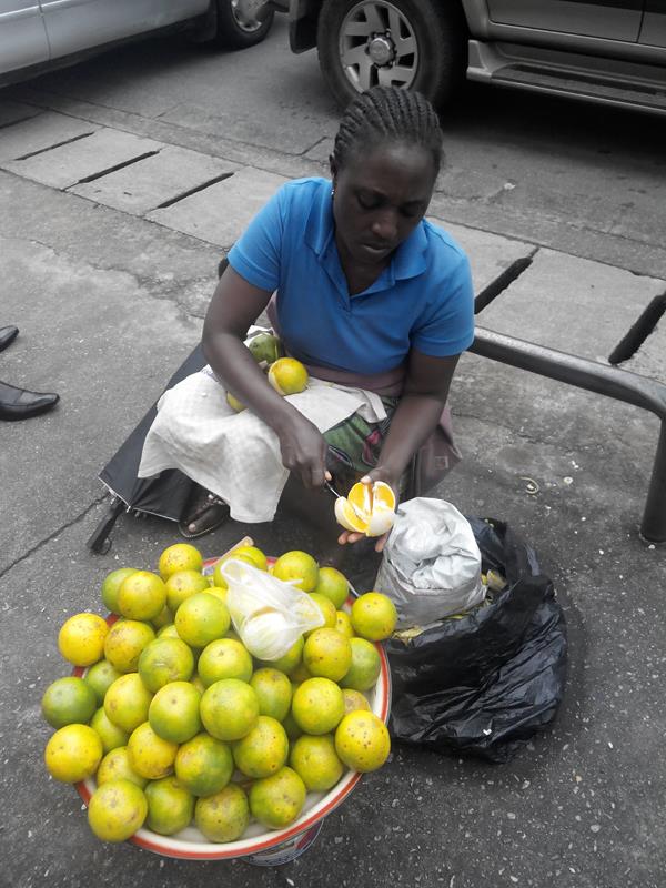 2013917121215_600x800Ở đây có văn hóa đội đầu bán hàng. Hàng gì cũng đội, cam quít mít dừa, quần áo giày dép. Mình vẫn ấn tượng các bạn trẻ cứ để một chiếc giày trên đầu, cứ thế nhong nhong khắp phố. Không hiểu ở đây liệu có coi cái đầu là linh thiêng không mà vứt cả giày lên đầu. Mà các bạn bán cam dạo rất nhiều, cam 100 franc/quả gọt sẵn. Cách gọt rất hay, gọt dọc từ trên xuống thành từng sợi mảnh.