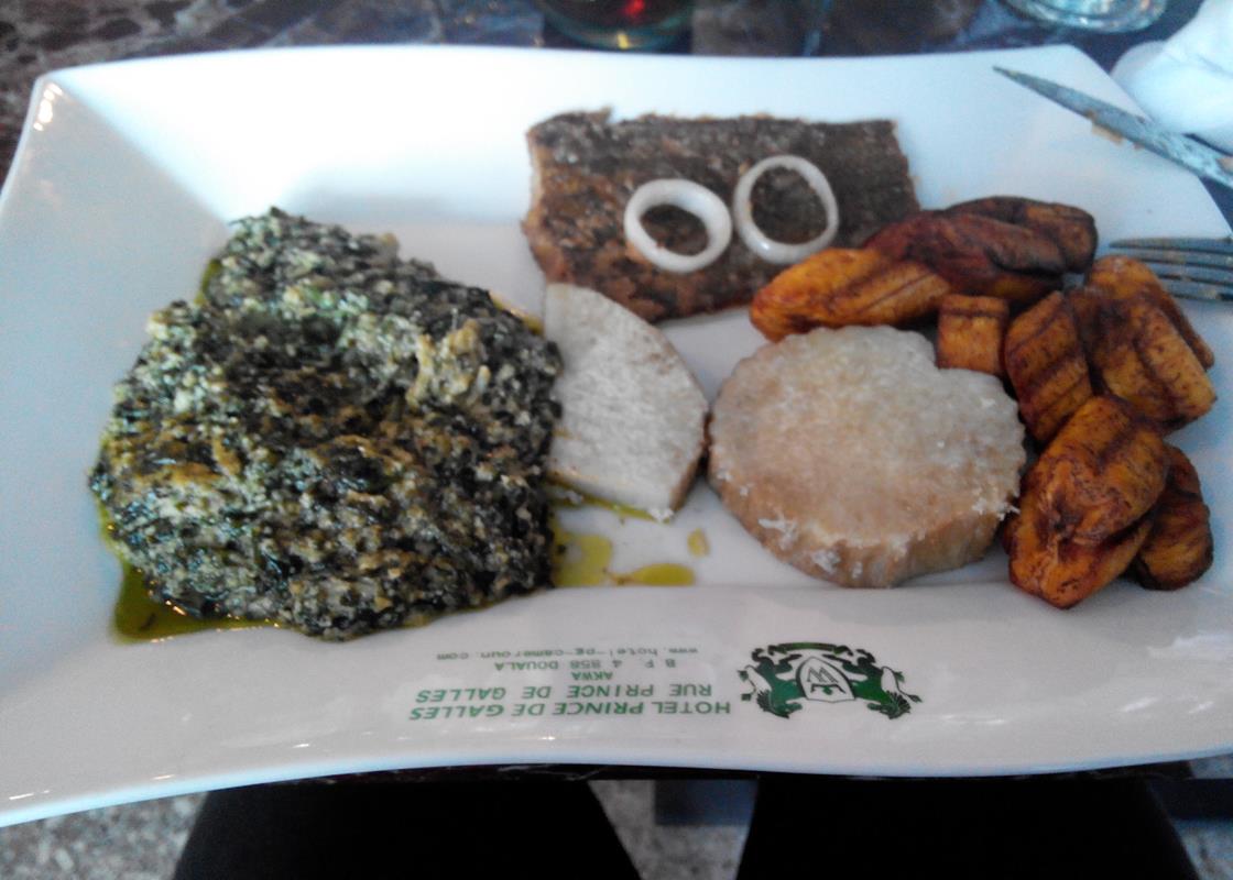 Món nhầy nhầy bên phải là món ăn truyền thống của CMR, ăn kèm với khoai hoặc chuối nướng. Chuối nướng ở đây rất ngon và phổ biến.