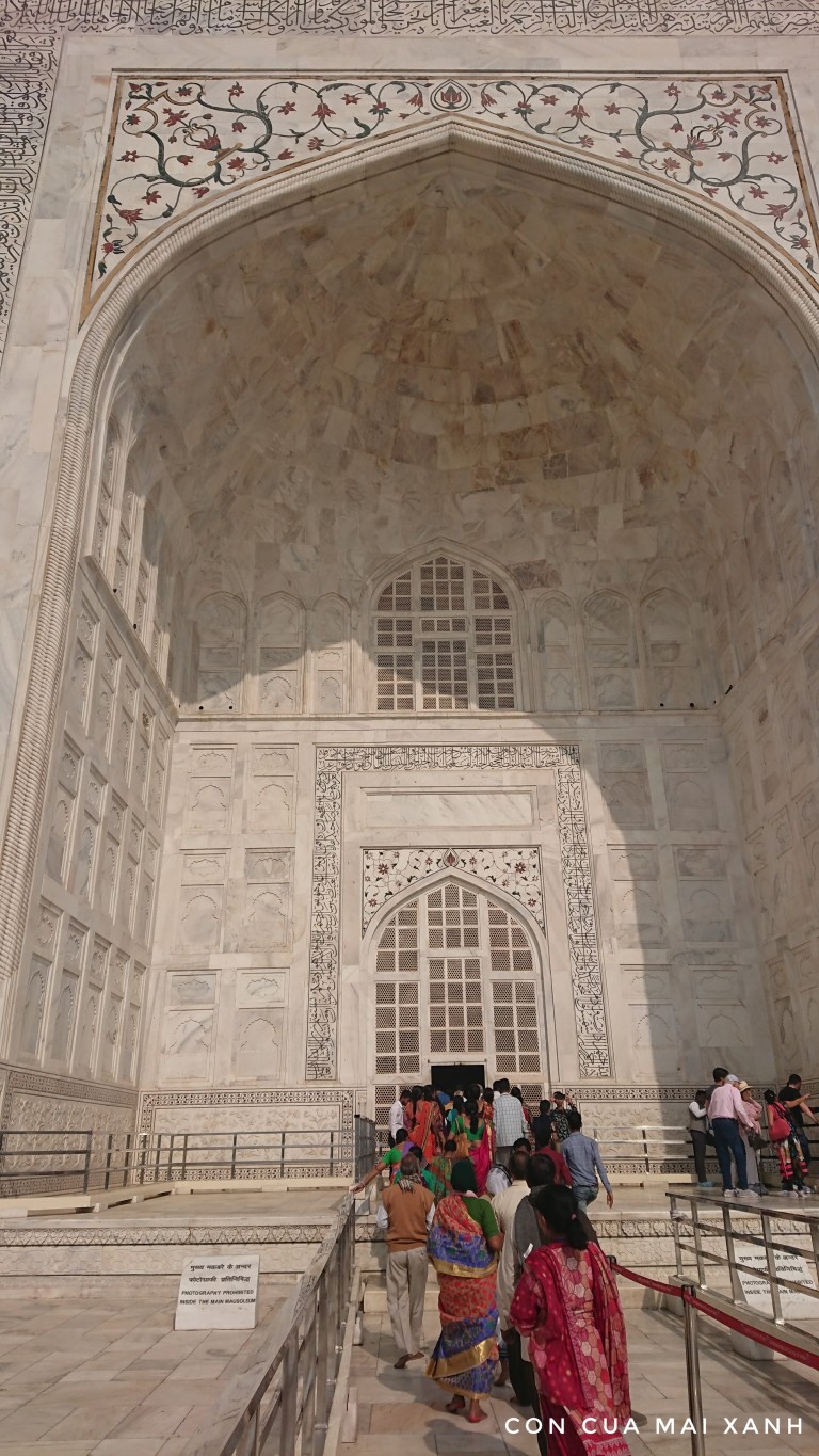 Dù sao đi nữa thì đây cũng là một công trình để đời, một kiệt tác mà người Ấn Độ để lại cho thế giới. Các bạn có thể tưởng tượng một tòa nhà bằng đá cẩm thạch trắng muốt siêu to khổng lồ, nằm xuất hiện chình ình trong một khu vườn cũng khổng lồ siêu to nó ấn tượng đến thế nào. Nghe nói đá cẩm thạch này sẽ đổi màu theo ánh nắng mặt trời, hoàng hôn hay bình minh gì đó sẽ có màu tím ngắt. Đấy là chuyện của hoàng hôn và bình minh, còn mình đến lúc chính ngọ nên chỉ thấy một màu trắng nõn nà. Trên các bức tường là những dòng chữ chắc trích từ kinh Quran. Các dòng chữ này cũng được làm bằng đá rồi ghép lại trên tường Taj Mahal. Phải nói là cực kì công phu, khó có thể không cảm thấy choáng ngợp bởi độ tỉ mỉ và tinh xảo của công trình này. Lời nói là vô ích, ảnh chụp từ điện thoại cùi càng khó thu hết được vẻ đẹp của nó. Chỉ có mắt thấy, tay sờ mới có thể cảm nhận được phần nào Taj Mahal.
