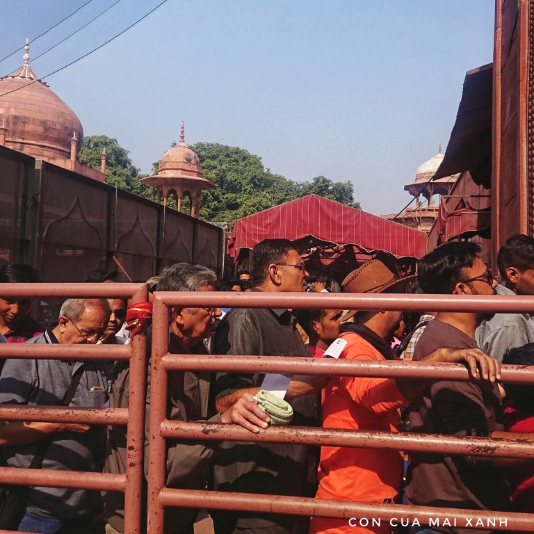 Đến Agra, việc đầu tiên là kiếm một xe tuk tuk chạy ra Taj Mahal đã. Ở Ấn Độ thì luôn có ít nhất hai quầy vé, một cho người Ấn Độ và một cho người nước ngoài. Vé cho người nước ngoài đắt chắc phải hơn chục lần là ít. Mình thì hoàn toàn ủng hộ duy trì hai giá vé kiểu này, khách đến chơi thì chịu khó mà bỏ tiền ra thôi. Vừa mua vé xong thì có bạn đeo thẻ hướng dẫn du lịch ra mời tour. Chào mời mình các kiểu, bảo mày xếp hàng thì còn mít mới vào được, nhìn cái hàng kia kìa. Nghĩ gặp khách sộp, nào ngờ cũng gặp một thằng rẻ tiền, mình là người có thời gian mà, cứ thong thả. Nhưng quả tình nhìn dòng người xếp hàng mình cũng hơi hãi hãi. Nhưng thôi đã trót rẻ tiền rồi, thì phải nhập vai thôi. Ơ mà nào ngờ có tổng cộng ba hàng, hàng ngoài cùng cho nam, hàng trong cùng cho nữ. Hai hàng này đông nghẹt, chắc phải mấy trăm người mỗi hàng. Lọt thỏm ở giữa là hàng cho người mua vé nước ngoài, vắng tanh như chùa bà đanh. Các bạn Ấn Độ chơi chiêu thật, chắc cũng khối bạn khách du lịch nghĩ là đông thế này kiếm bạn tour guide cho đỡ phải xếp hàng.
