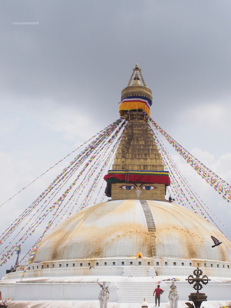 Nepal mặc dù đến 80% dân theo đạo Hindu nhưng lại là đất tổ của đạo Phật, bởi Phật Thích Ca vốn được sinh ra ở Nepal. Thế nên biểu tượng du lịch không chính thức của Nepal là con mắt Phật, đi đâu cũng thấy đồ lưu niệm có con mắt này. Ngay giữa Kathmandu là tháp Boudhanath, mà nghe nói ở đây có xá lợi Phật, còn Phật nào và xá lợi gì thì mình cũng không biết. Có vẻ chỉ ở Đông Á mới thắp hương trong chùa nhiều, còn ở Nepal mọi người chủ yếu đốt nến và dầu. Đạo Phật ở đây mình đoán là phái Tây Tạng, cũng có quả chuông luân hồi xoay xoay nhìn rất tếu mắt.