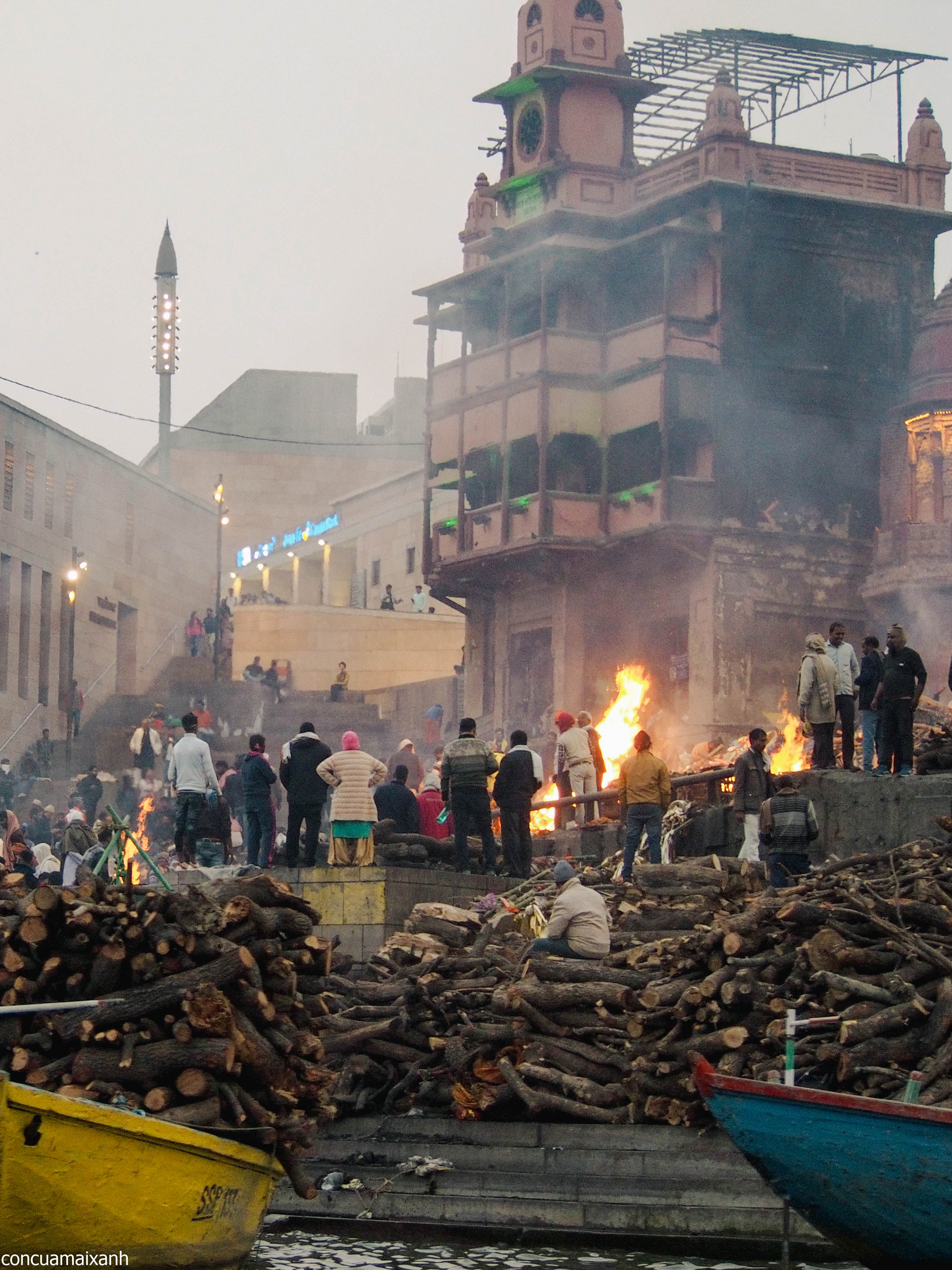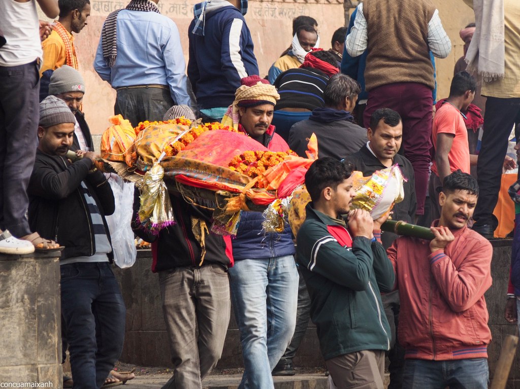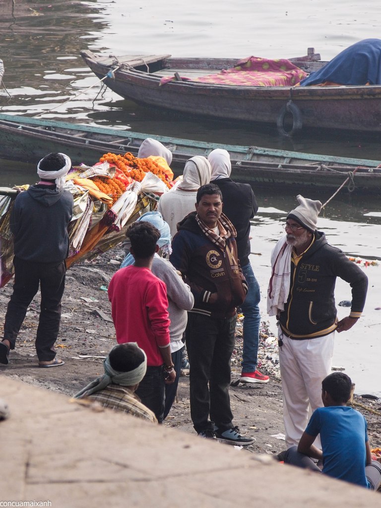 Đi vòng ra đằng sau cái ghat này sẽ là nơi chuẩn bị thi hài để thiêu. Ở đây sẽ có mấy bạn gạ dẫn đi lên đỉnh tháp để nhìn xuống cho rõ “for learning purpose”. Mình thì không háo hức nhìn người chết lắm, cộng với việc đường cứ nhớp nháp, không hiểu nước này trộn với những thứ gì trên đời nữa (phân bò thì chắc rồi, vì rất nhiều cục to chình ình), nên không lên làm gì.