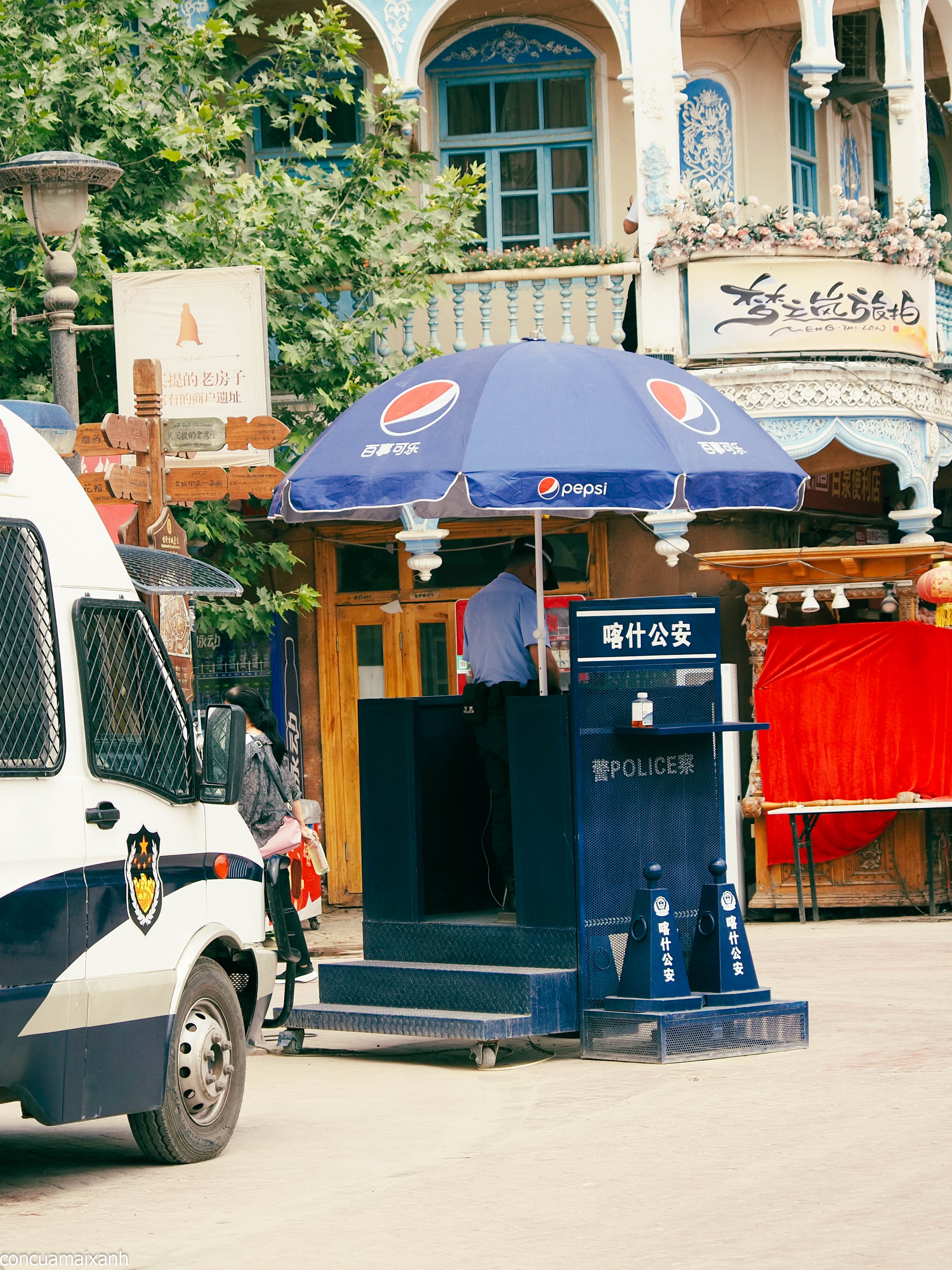 Ngoài cam thì hiếm có ở đâu trên thế giới này mà thấy nhiều bốt công an như ở đây, cách 1-2 ngã tư đều có bốt công an. Công an thì cả người Hán cả người Duy Ngô Nhĩ. Bên cạnh công an thì ra đường thỉnh thoảng thấy xe bọc thép chạy vòng vòng. Đi nội tỉnh nhưng có những huyện phải xin giấy thông hành để ra vào huyện. Vì mình là người nước ngoài nên việc xin giấy thông hành cũng không hẳn là dễ, nhưng được cái là người Việt Nam chứ không phải người nước Hồi Giáo nào nên chắc cũng thoải mái hơn. Trong suốt chuyến đi của mình thì không thấy có bạo loạn nào xảy ra, nhưng không cần là người địa phương cũng có thể thấy không khí bảo đảm an ninh khá căng thẳng.